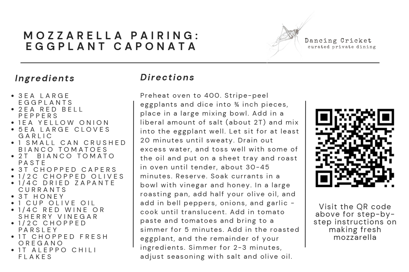 If you’ve made it this far, I hope you have taken a bite of your fresh mozzarella and are enjoying the fruits of your labor. I like to put an excessive amount of olive oil on top of my mozzarella after slicing, and enjoy it with lots and lots of bread. Below is a recipe for eggplant caponata if you are looking for a perfect pairing with your fresh cheese.